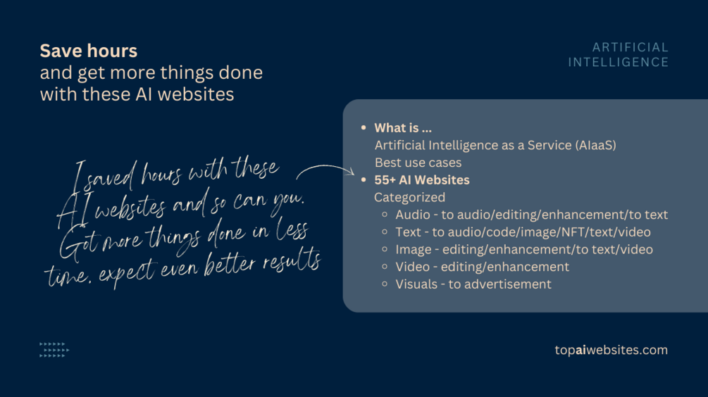 A curated list of 55+ AI websites for writers, marketers & creators 🚀 that will help you to boost your productivity and business. Save hours and hours on research and start with this list of curated AI websites right away. Get productive in seconds.